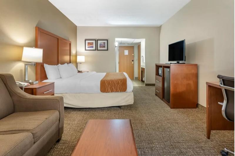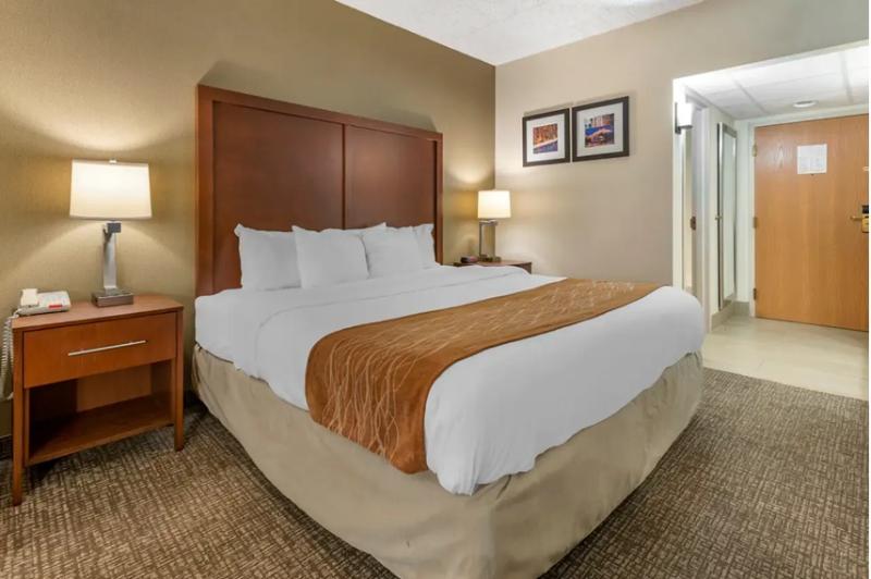 The Comfort Inn in West Hazleton, Pennsylvania, ensures a restful stay. Located near Interstates 81, 80, and 476, it offers convenient access to the Pocono Mountains, Paragon Adventure Park, Penn State Hazleton, Laurel Mall, Pocono Market Fair, and Eagle Rock Golf & Ski Resort. Enjoy on-site dining at the Timbers Restaurant and Lounge, along with amenities such as free Wi-Fi, complimentary breakfast, copy and fax services, a free weekday newspaper, and free coffee. Spacious guest rooms feature TVs, microwaves, refrigerators, coffee makers, desks, hair dryers, irons, and ironing boards. Select rooms also offer hot tubs. Additionally, earn rewards like free nights and gift cards through the Choice Privileges Rewards program.